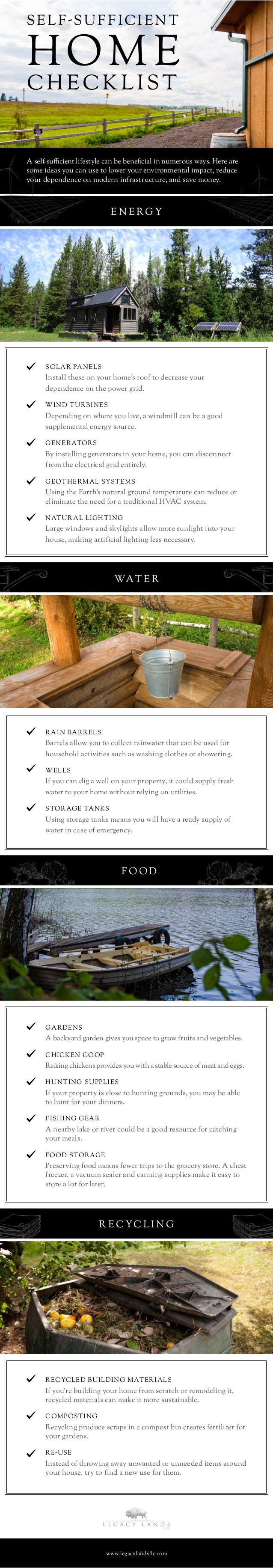 Start with simple elements such as natural lighting and rain barrels, and add activities such as fishing, gardening and composting. This can be the beginning of a formula for creating a self-sufficient home. The resultant benefits include a reduced impact on the environment, less dependence on modern infrastructure, and fewer expenses.