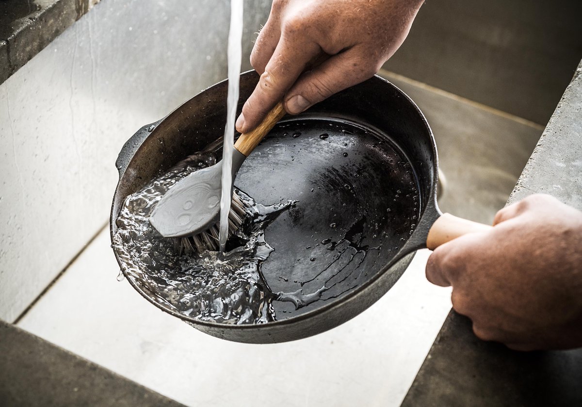 Salt is an effective cleaner proven to clean a cast-iron pan. Add two tablespoons of oil and place on medium heat when the container is heated pour in 3 tablespoons of salt. Then use a tong to hold a paper towel - scour until clean. Finally, rinse and coat and the job are done!