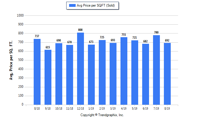 Average Sold Price per Square Footage in August 2019: $692. Down 11.3% compared to last month