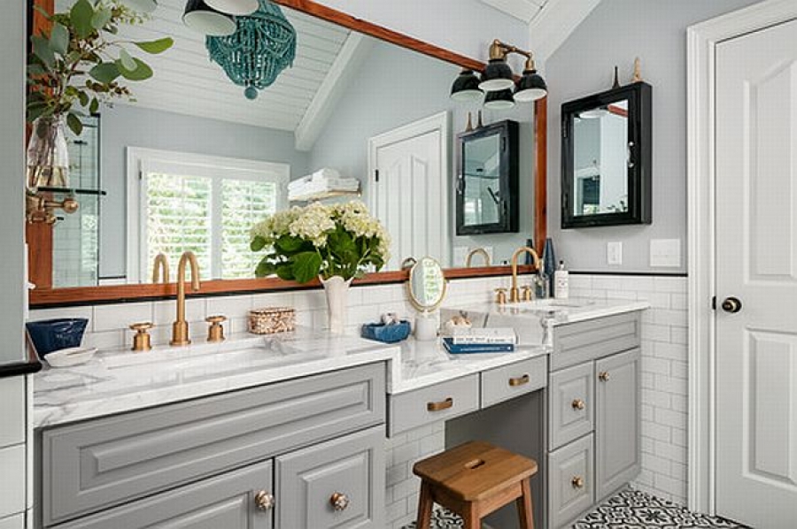 Savings: I reused the original vanities, mirror and bathtub. The planks were already on the ceiling, and I already had great doors with hardware that worked well with the new finishes.