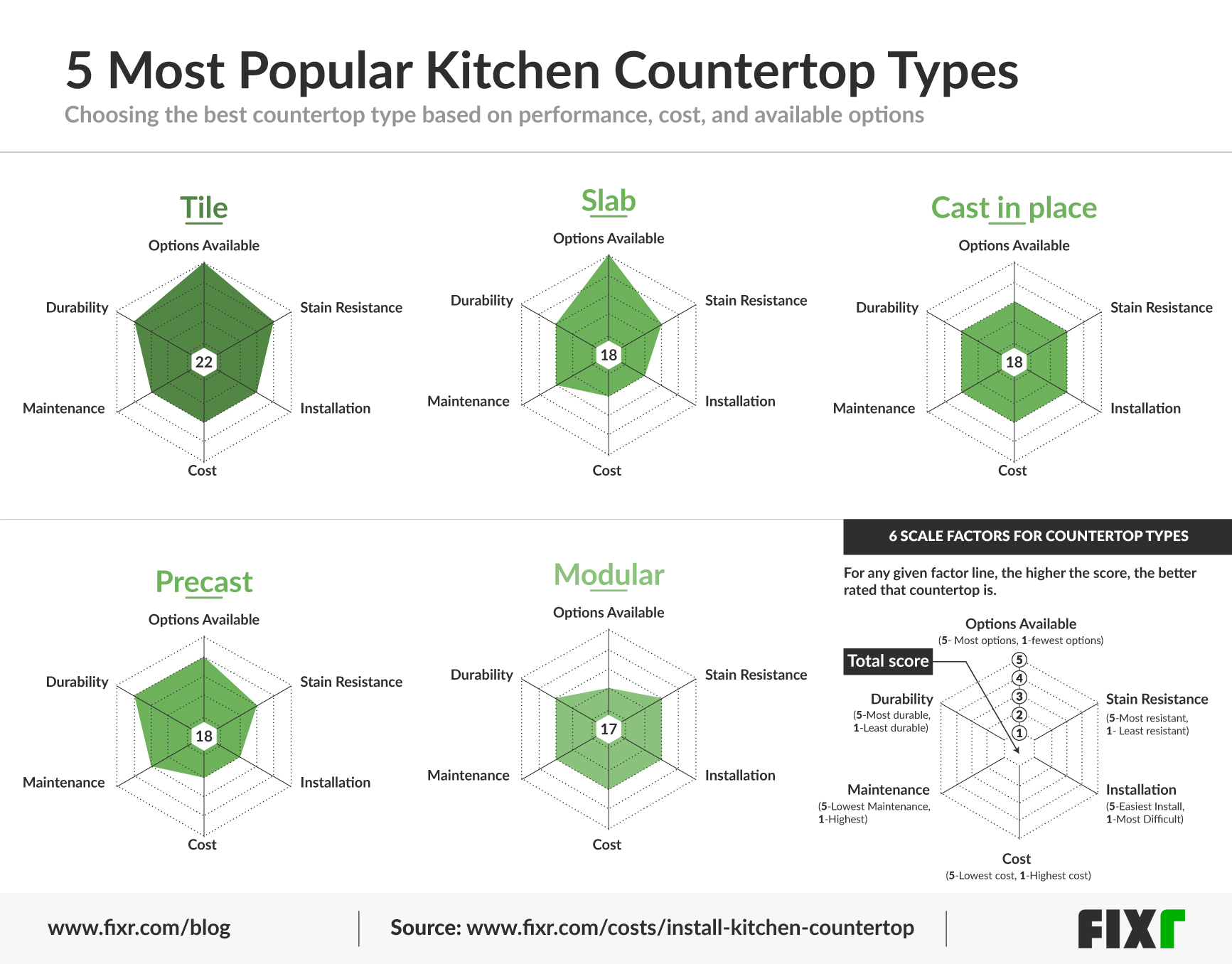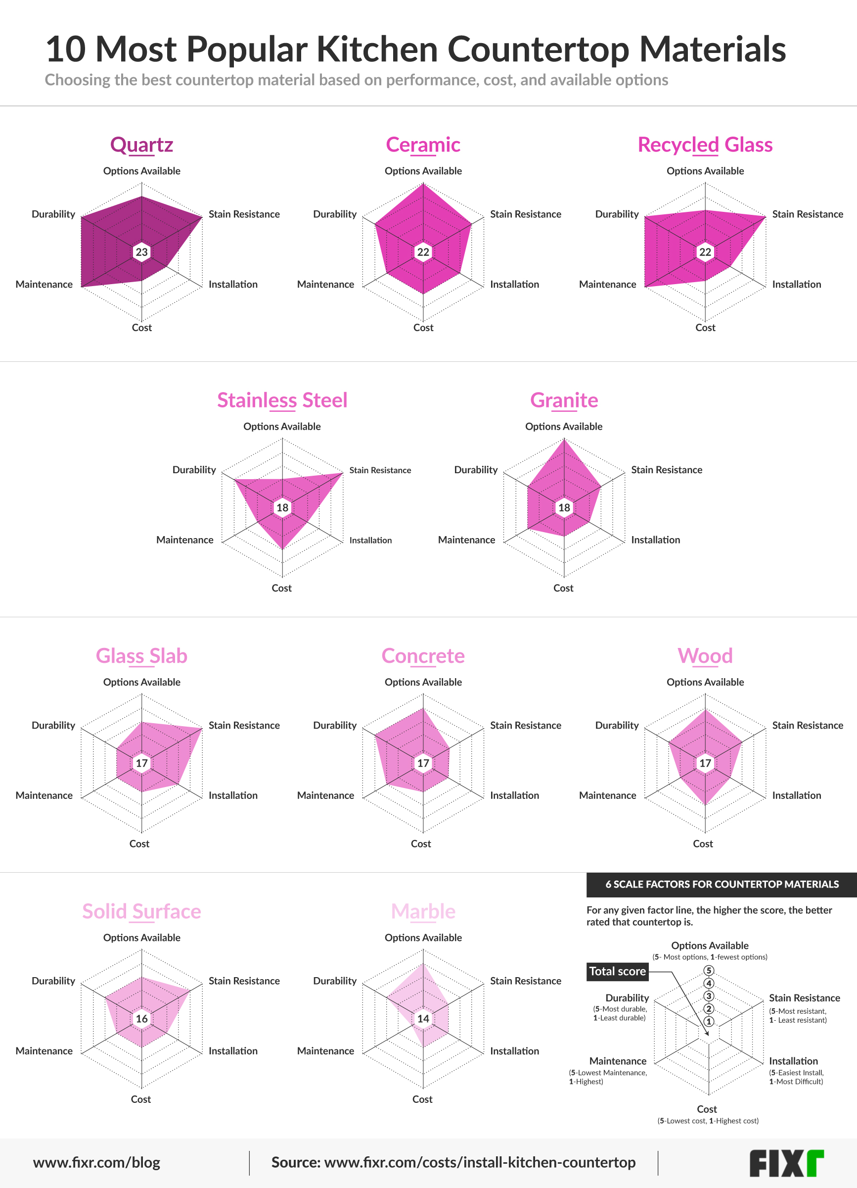 When planning your kitchen, you need to be aware of certain factors when it comes to the type of your countertop. To streamline the selection process, Fixr created the below two graphics using 6 key variables. The same 6 variables were considered in both graphics, however, the focus changes depending on the graphic which will be explained further in each section.