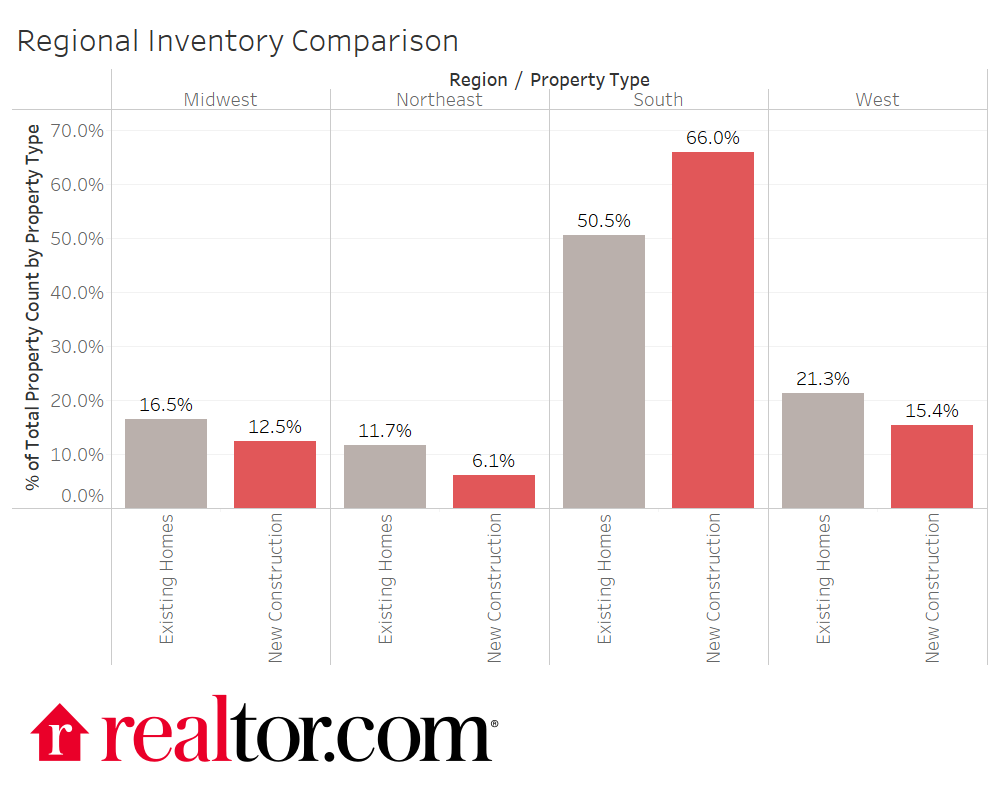Realtor.com® housing data as of June 2025. Listings include the active inventory of newly built single-family homes and condos/townhomes/row homes/co-ops for the given level of geography on Realtor.com®. Realtor.com® data history goes back to July 2016. Cross market data includes all views of listing detail pages on Realtor.com® during the second quarter of 2025.